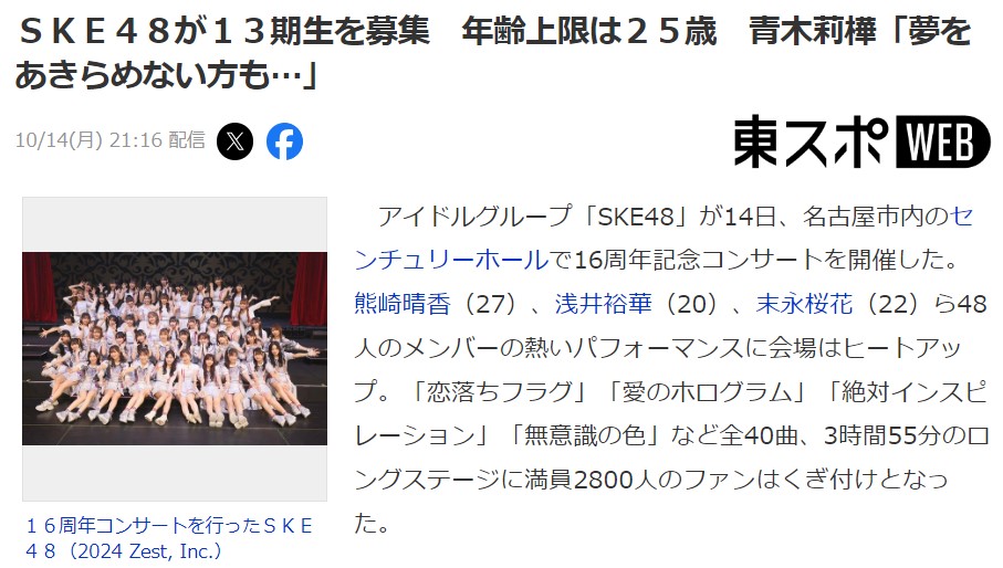 SKE48、13期生オーディション開催!年齢上限は25歳!!!
