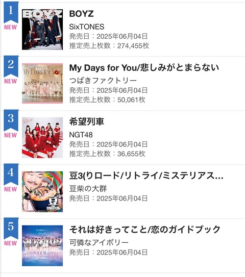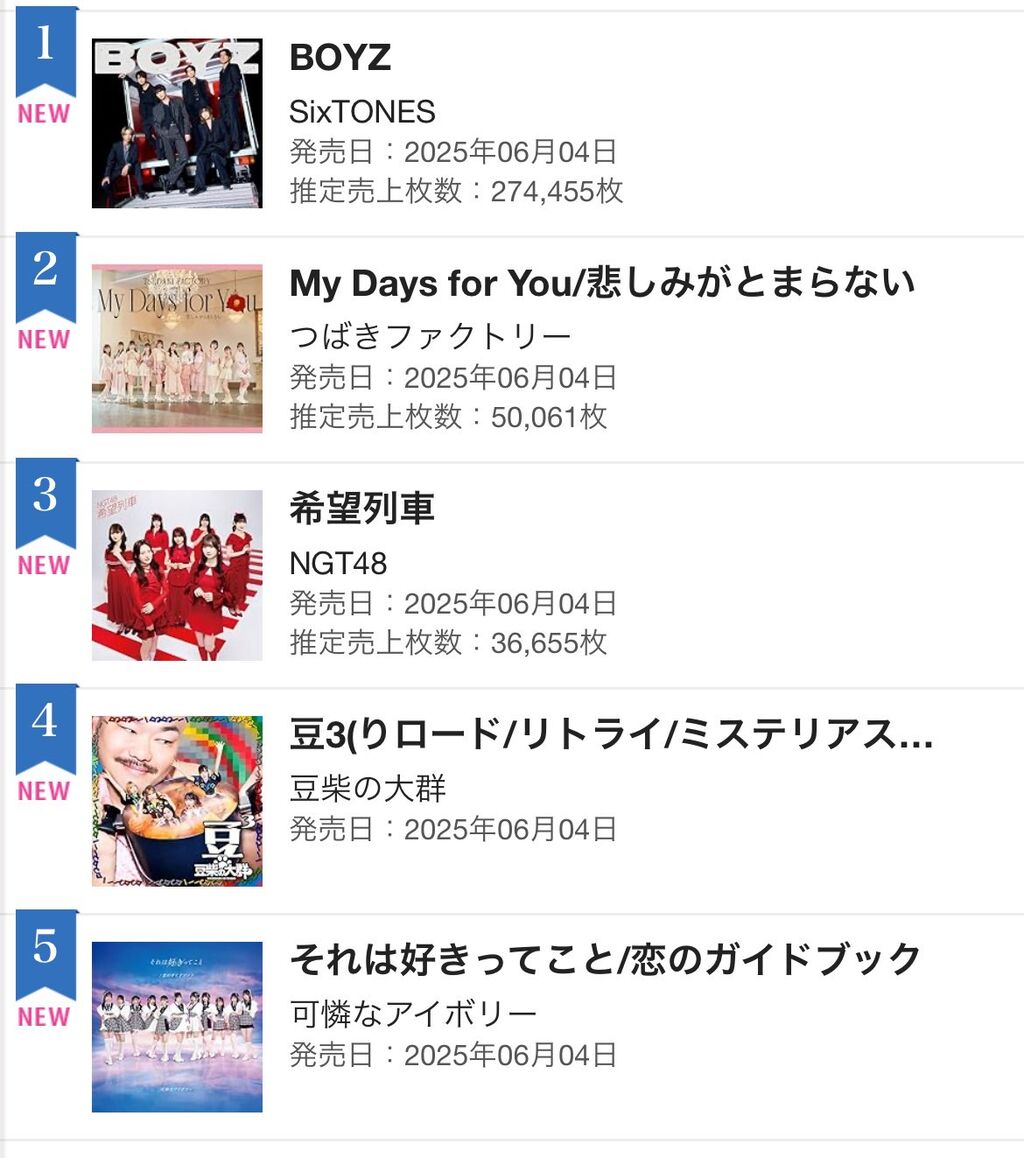 【NGT48】11thシングル「希望列車」初日売上36,655枚 スポンサーリンク NGT48 2025/06/04 21:29 【NGT48】11thシングル「希望列車」初日売上36,655枚 738: 名無し48さん(仮名) 2025/06/04(水) 18:01:00.58 3位キター! https://www.oricon.co.jp/rank/js/d/2025-06-03/ 続きを読む