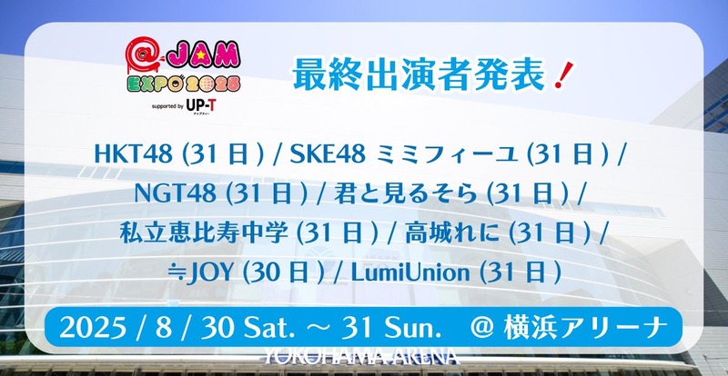 【お知らせ】「@ JAM EXPO 2025 supported by UP-T」に出演! スポンサーリンク HKT48 2025/08/04 15:39 【お知らせ】「@ JAM EXPO 2025 supported by UP-T」に出演! 続きを読む