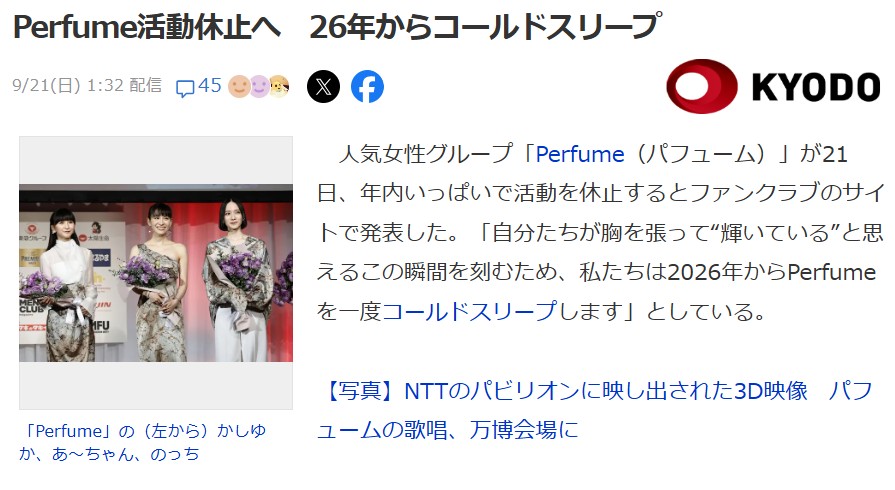 Perfume活動休止へ 26年からコールドスリープ【年内での活動休止を発表】