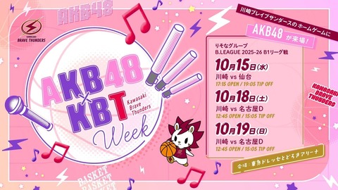東急ドレッセとどろきアリーナで行われる、10月15日(水)仙台89ERS戰、10月18日(土)・19日(日)名古屋ダイヤモンドドルフィンズ戦の3日間を「AKB48×KBT WEEK」として開催!