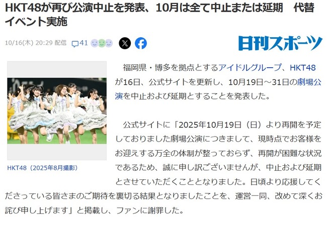 【悲報】HKT48が再び公演中止を発表、10月は全て中止または延期 代替イベント実施!! スポンサーリンク AKB48 2025/10/17 22:23 【悲報】HKT48が再び公演中止を発表、10月は全て中止または延期 代替イベント実施!! 続きを読む