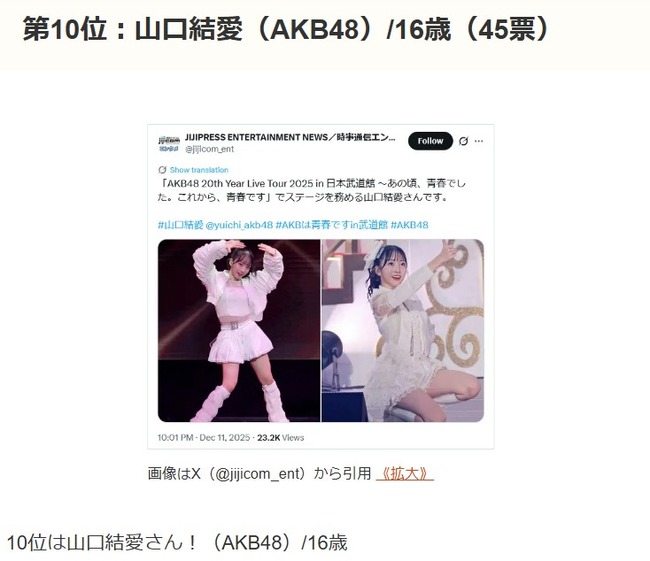 [紹介元] AKB48タイムズ(AKB48まとめ) – AKB48 「10代」の美少女アイドル人気ランキングに山口結愛(AKB48)がランクインする快挙!【2026年版】