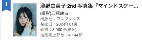 【速報】瀧野由美子 2nd写真集『マインドスケープ』初週売上4,144部で1位発進🥇