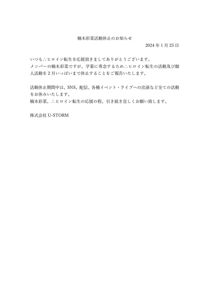 メンバーの楠木彩菜ですが、学業に専念するため∴ヒロイン転生の活動及び個人活動を2 月いっぱいまで休止することをご報告いたします。