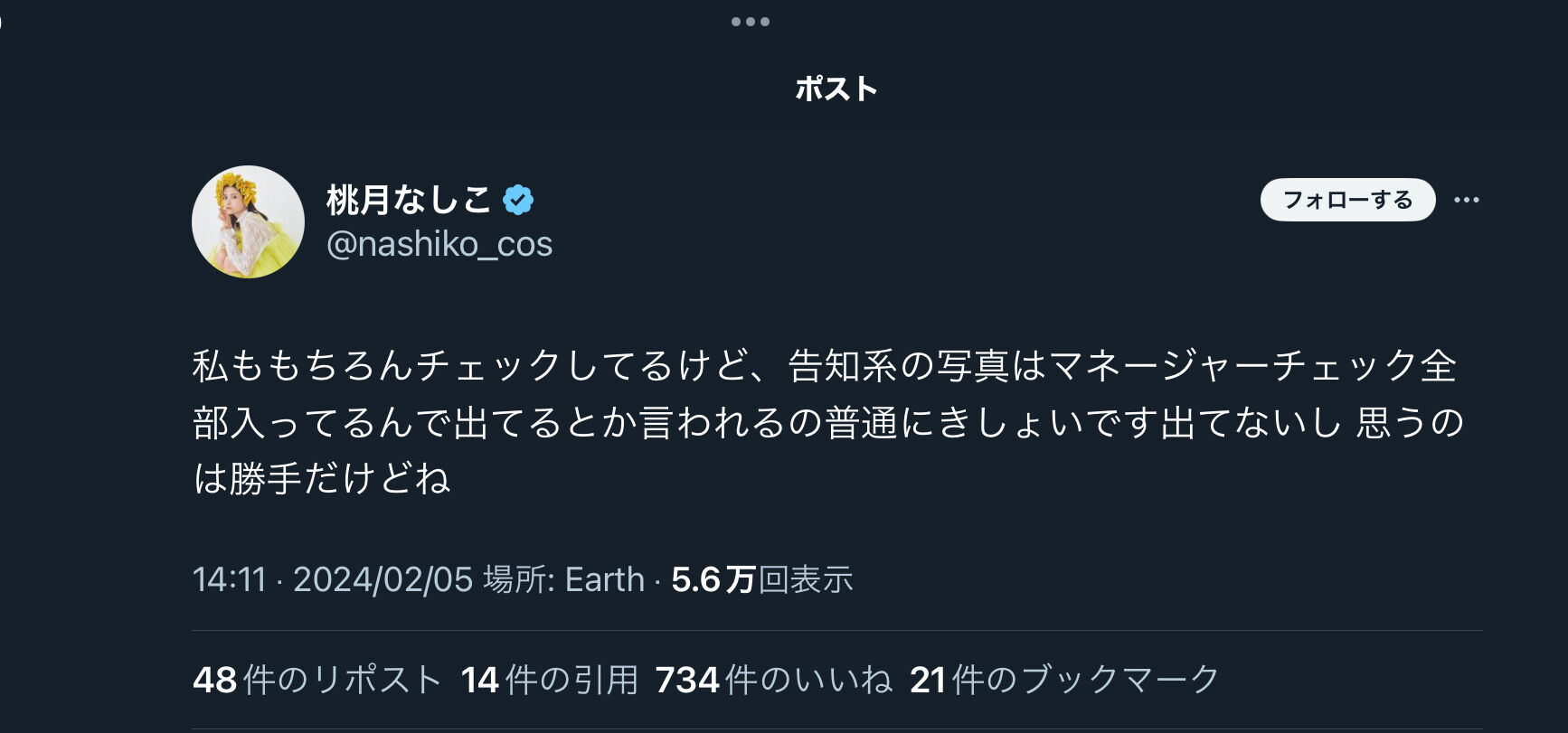 【闇深】桃月なしこ(28歳)「変態野郎、普通にきしょいです。出てないから。」 スポンサーリンク HKT48 2024/02/06 14:17 【闇深】桃月なしこ(28歳)「変態野郎、普通にきしょいです。出てないから。」 1: 名無し48さん (無能) 2024/02/05(月) 16:41:33.70 !extend:none:none:1000:512 !extend:none:none:1000:512 画像 https://imgur.com/iABBdun.jpg VIPQ2_EXTDAT: none:none:1000:512:: EXT was configured 続きを読む