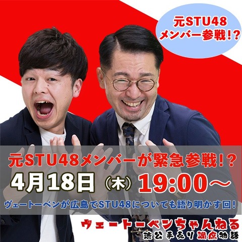 元STU48メンバーが4/18(木)の『ヴェートーベンちゃんねる』に緊急参戦!? スポンサーリンク STU48 2024/04/17 12:59 元STU48メンバーが4/18(木)の『ヴェートーベンちゃんねる』に緊急参戦!? 864: 名無しさん@お腹いっぱい。 2024/04/17(水) 00:32:25.83 元STU48メンバーが緊急参戦!?ヴェートーベンと広島の居酒屋でSTU48について語り明かす!! 2024/4/18(木) 19:00開始 https://live.nicovideo.jp/watch/lv344943699 続きを読む