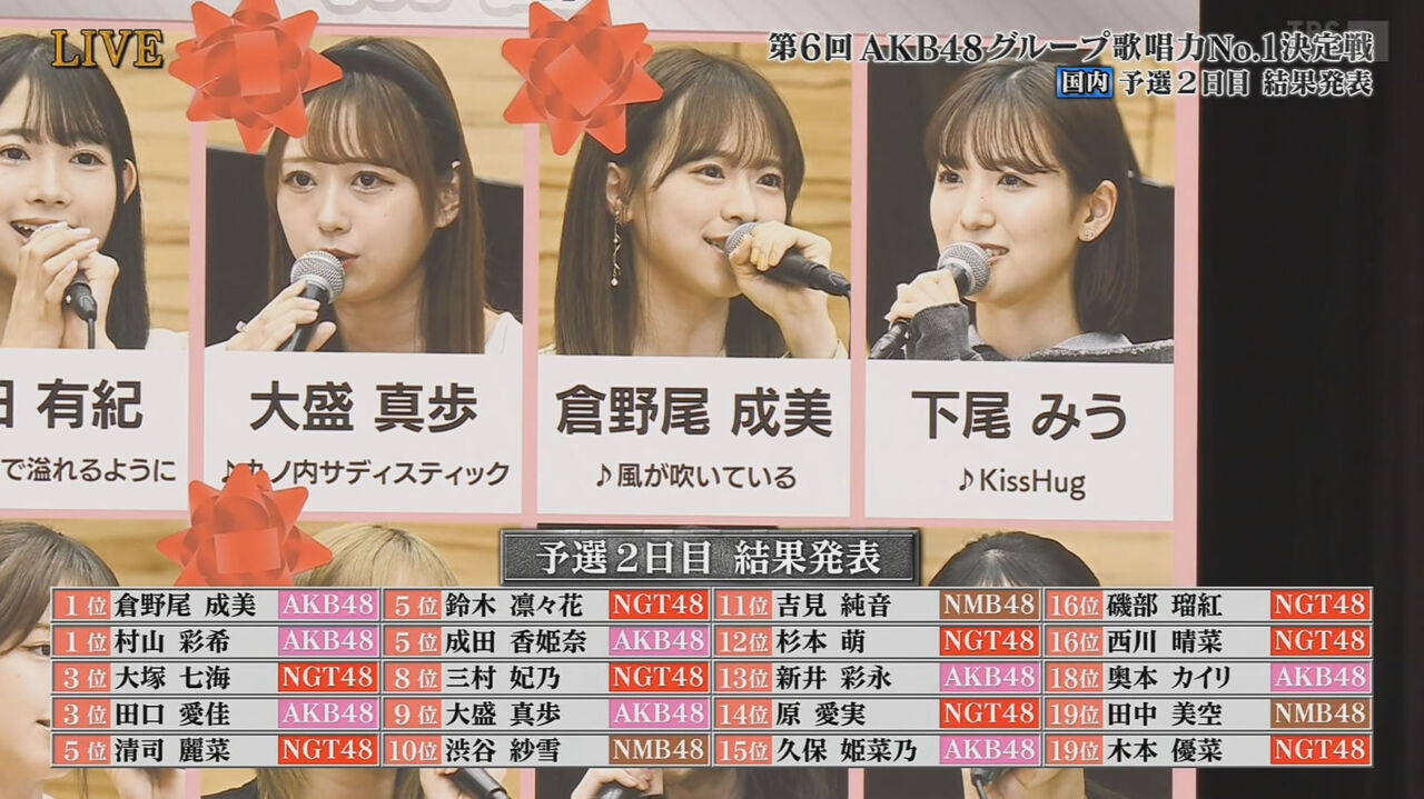 【第6回 AKB48グループ歌唱力No.1決定戦】2日目1位は村山彩希と倉野尾成美!! 予選2日目の結果