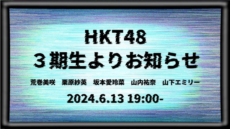 【お知らせ】あす 6月13日(木)19:00〜HKT48 3期生が生配信でお知らせあり スポンサーリンク HKT48 2024/06/13 02:49 【お知らせ】あす 6月13日(木)19:00〜HKT48 3期生が生配信でお知らせあり 続きを読む