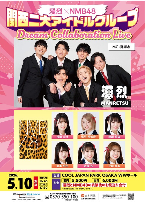 📣お知らせその②📣イベント開催決定!✨\漫烈×NMB48 ~関西二大アイドルグループ Dream Collaboration Live~/✨5/10(日) 16:45開場/17:30開演@ COOL JAPAN PARK OSAKA WWホール前売 ¥5,500/当日 ¥6,000終演後は合同お見送り会付き★【先行販売】4月5日(日) 11:004/9(木) 11:00 pic.twitter.com/ZTJqYEY23l— 漫烈【公式】 (@Manretsu_staff) April 5, 2026