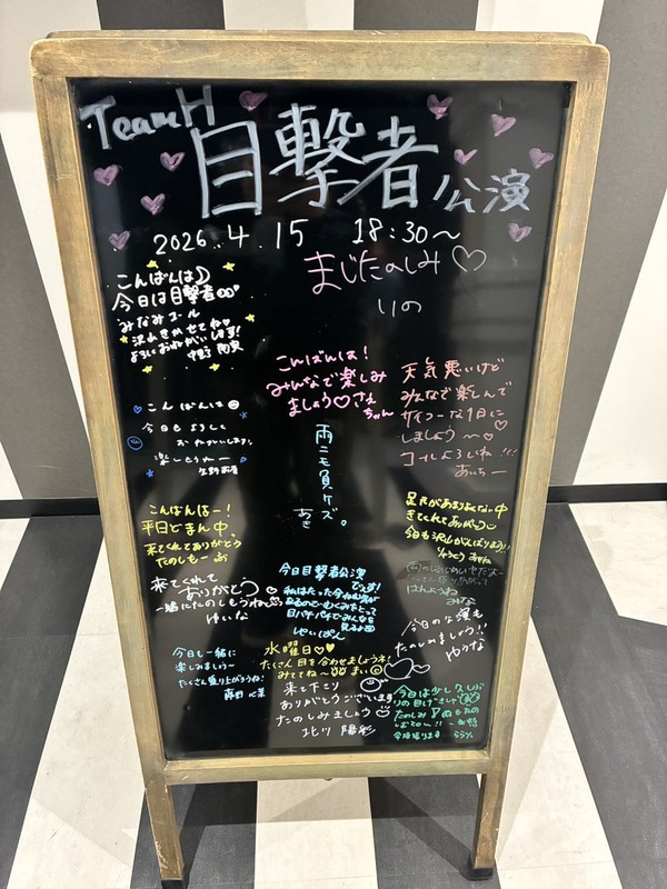2026/4/15 18:30 チームH「目撃者」公演 スポンサーリンク 2026/04/15 22:39 2026/4/15 18:30 チームH「目撃者」公演 [紹介元] HKT48いもまと(HKT48のまとめサイト) 2026/4/15 18:30 チームH「目撃者」公演