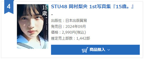 【STU48】岡村梨央 1st写真集『15歳。』初週売上1,442部 スポンサーリンク STU48 2024/10/04 16:59 【STU48】岡村梨央 1st写真集『15歳。』初週売上1,442部 468: 名無し48さん 警備員[Lv.21] 2024/10/04(金) 11:10:14.72 STU48 岡村梨央 1st写真集『15歳。』出版社:日本出版貿易発売日:2024年09月価格:2,990円(税込)推定売上部数:1,442部 続きを読む